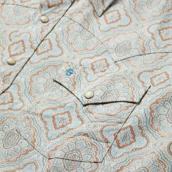 This Western shirt is crafted from a lightweight cotton poplin with a rich Aqua paisley print. It features a one-point curved back yoke, classic snap front featuring opaque logo snaps, and three snap cuffs. The front left pocket is adorned with the Stetson “S” logo and the right sleeve placket is embossed with “STETSON”. It has a contrast inside trim and is crafted with 100% cotton for quality, breathability and comfort.