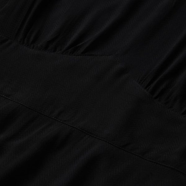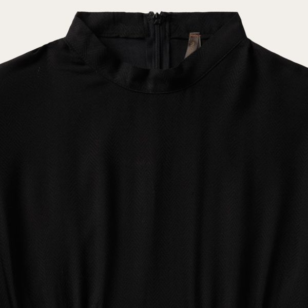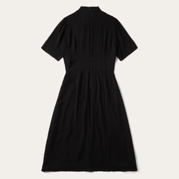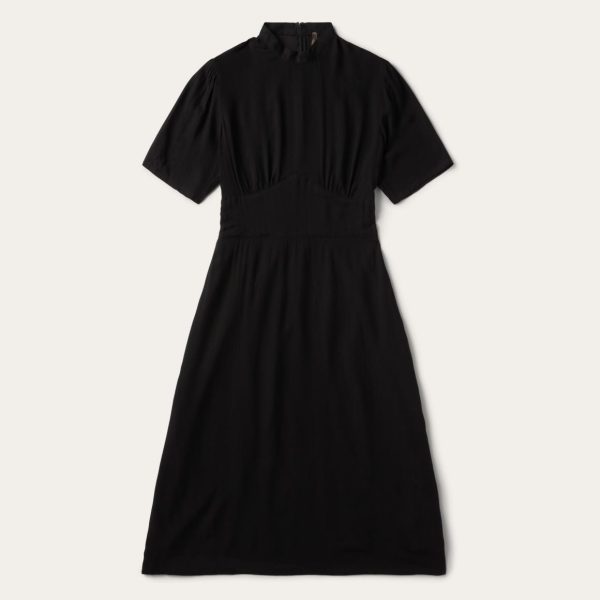 This stylish black midi dress has short sleeves with a slight puff at the shoulder and a stand collar with hook & eye and an invisible zipper closure. It’s gathered at the bust and back darts above a fitted waistband, for a flattering fit. Woven from high-quality rayon herringbone twill that has been yarn-dyed for rich lasting color, it’s crafted for comfort and made for easy movement.
