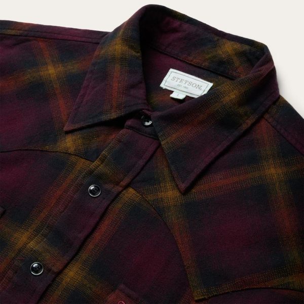 This rugged snap-front flannel shirt features an exclusive black wine plaid pattern along with classic western style details like a one-point curved back yoke and a three-snap roper cuff. Crafted from a 100% cotton twill flannel that has been yarn-dyed for rich, lasting color and brushed for a soft appearance, the shirt is garment washed, giving it the lived-in feel of an old favorite that will break in further over time. It has a spread collar with collar stays to keep it in place and is cut in our Original Fit, which allows for comfort and freedom of movement. Exceedingly durable and always comfortable, our shirts are hard-wearing and built to last.