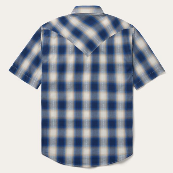 This short-sleeved western shirt is crafted from a yarn dyed cotton dobby and features our exclusive Blue Ombre plaid. It has a one point ultra deep curved back yoke, the Stetson “S” embroidered on the front left pocket, and “STETSON” embroidered on the right sleeve placket. The classic snap front features logo pearl snaps and is finished with contrast inside trim.