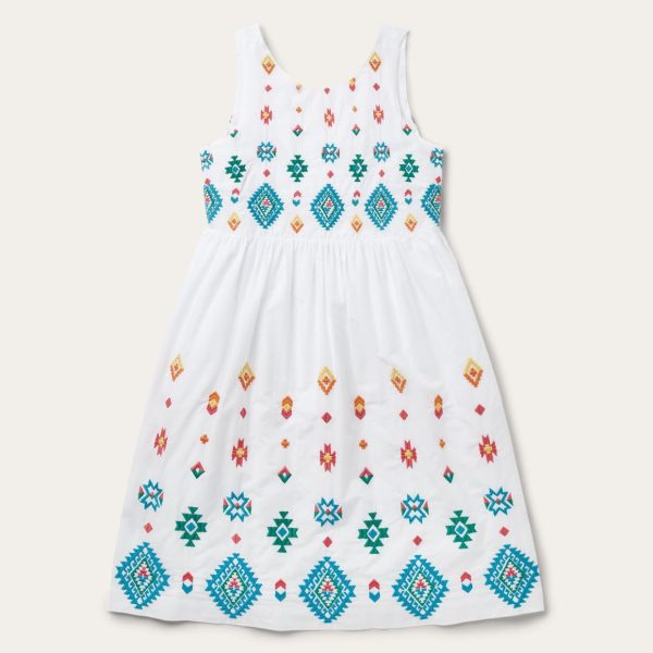 Colorful, lightweight and versatile, this white cotton lawn dress is embroidered with our vibrant red, yellow and turquoise Bright Schiffli design. It has an empire waist and large V back with a button strap closure. Darts at the bust provide a more custom-like fit, while the gathered skirt hits below the knees for a timeless silhouette. Made with smooth 100% high-quality white cotton lawn fabric, this lightweight, Western-inspired dress is ideal for any warm-weather gathering.
