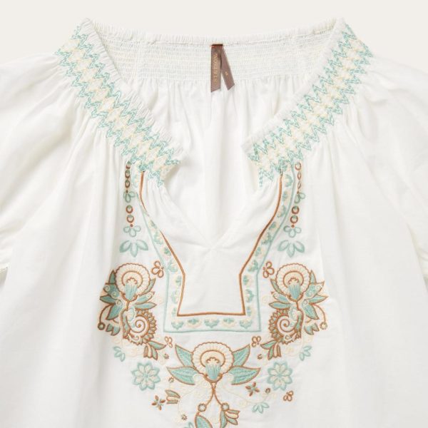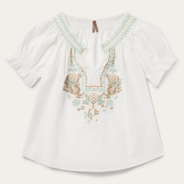This short-sleeved pullover peasant blouse features an intricate floral embroidered detail. Crafted of 100% cotton voile which has a soft feel and a flowing appearance, the blouse has an easy, flattering drape that allows for all-day comfort and freedom of movement.