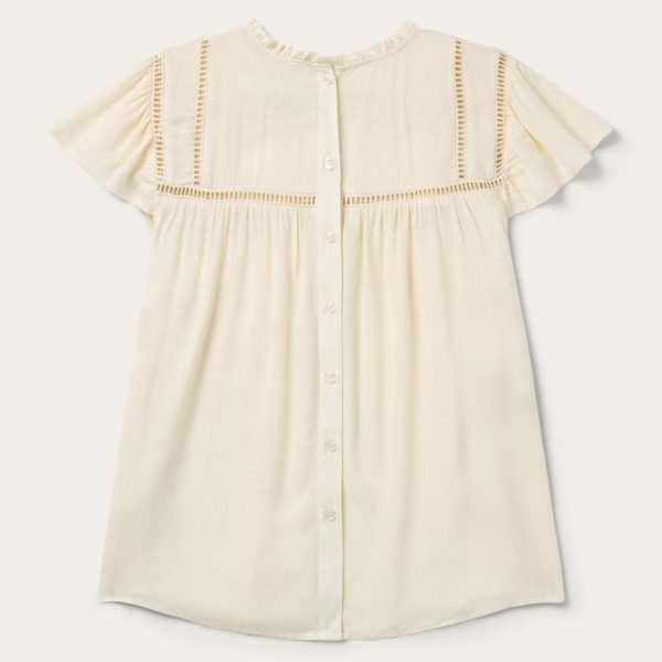 This short-sleeved blouse is crafted from soft, stylish 100% rayon herringbone. It has a full back button placket, flutter cap sleeves, straight front and back yokes with open loop stitching, a swing fit below the yoke and a ruffle at the neck. Cut with an easy, flattering drape, the blouse allows for all-day comfort and freedom of movement.