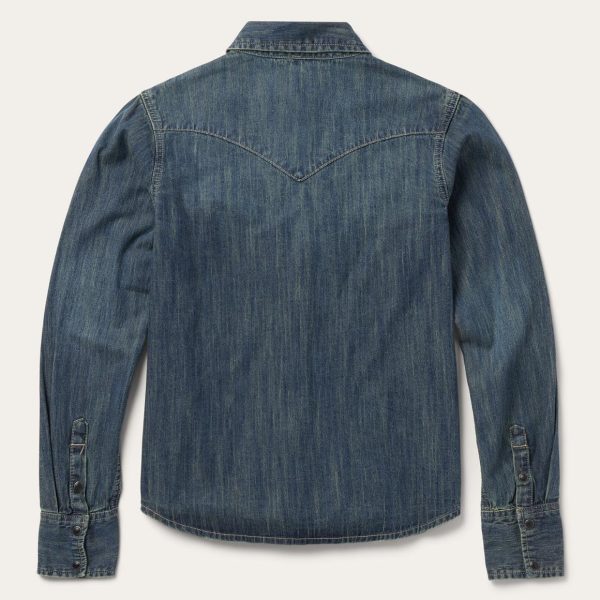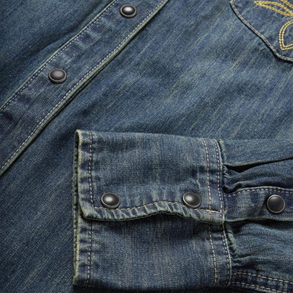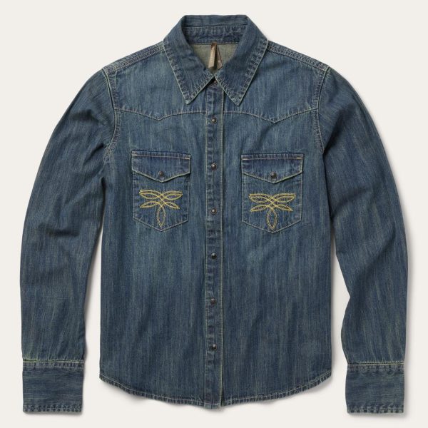 This long sleeve snap front shirt is crafted from 100% cotton with a dark blue “dirty denim” rinse and features a stunning embroidered detail on its single-point patch front pockets. Garment washed for a soft, comfortable feel that will only improve over time, its western-inspired style details include curved single-point front and back yokes and three snap roper cuffs. This everyday essential is cut in our flattering Boyfriend Fit, which allows for comfort and freedom of movement.