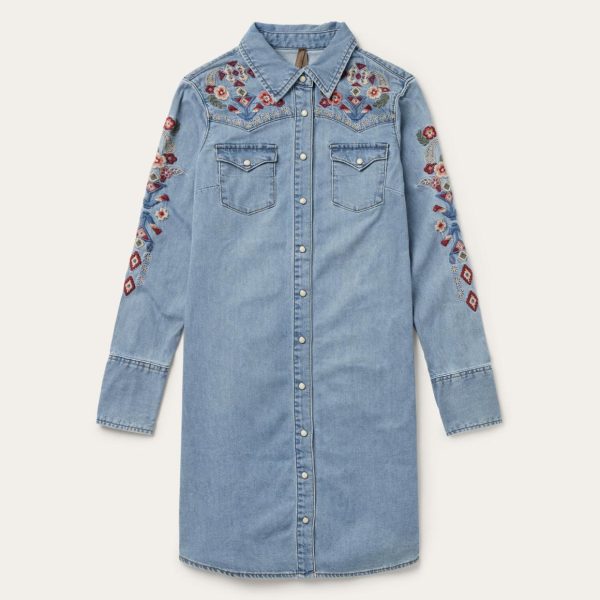 This head-turning embroidered shirt dress is crafted from 100% cotton denim that is a garment wash for extra softness and a lived-in feel. Featuring a classic shirt dress silhouette, it has one point front and back yokes, one point pockets and flaps, and five snap cuffs. The stunning Southwest-inspired embroidered details that extend down the arms and back take the dress from wardrobe staple to statement piece.