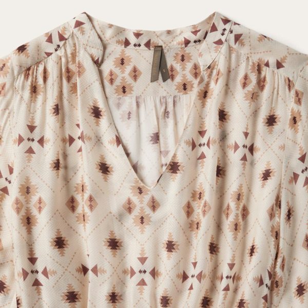 This mid-length zippered dress is woven from 100% rayon herringbone and features an allover, Western-inspired Gaucho Border print. It has 3/4 sleeves with elastic cuffs, a stand collar with a V-neckline, a straight back yoke with gathers below, an elastic waist and side seam pockets.