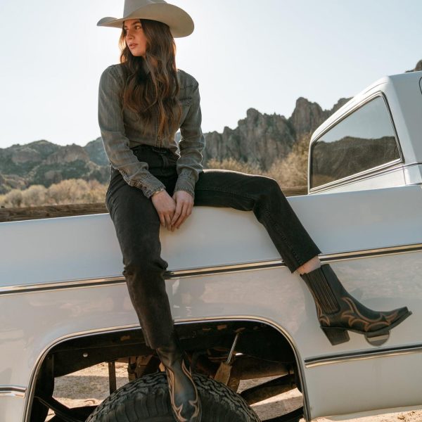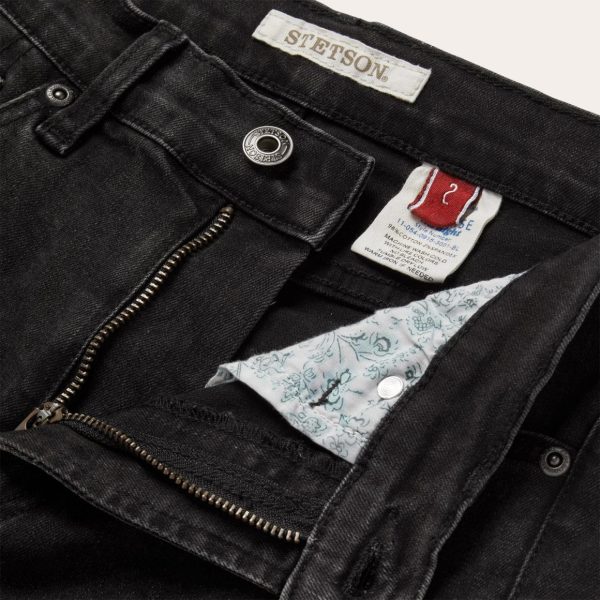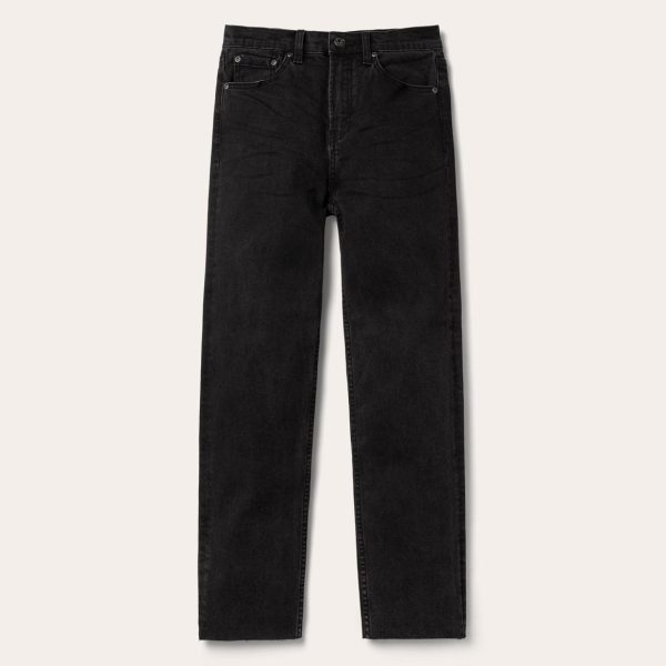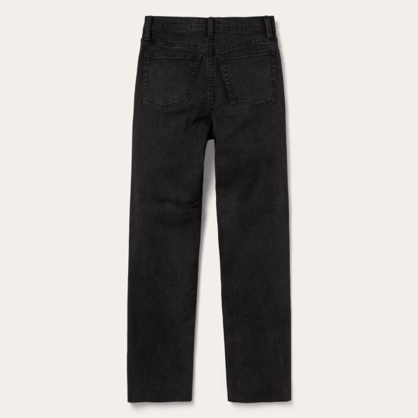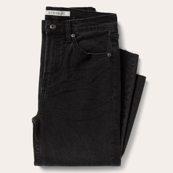 These black 915 High Rise Straight Fit Crop jeans are crafted from cotton denim with just enough stretch for comfort. They have a contour waistband that sits just below the waist, 5-pocket style, and a raw edge hem that is cropped to the ankle. The plain back pockets are finished with Stetson branded buttons, rivets, and zipper, and the jeans are finished with gentle sanding and whisker details for a lived-in look.
