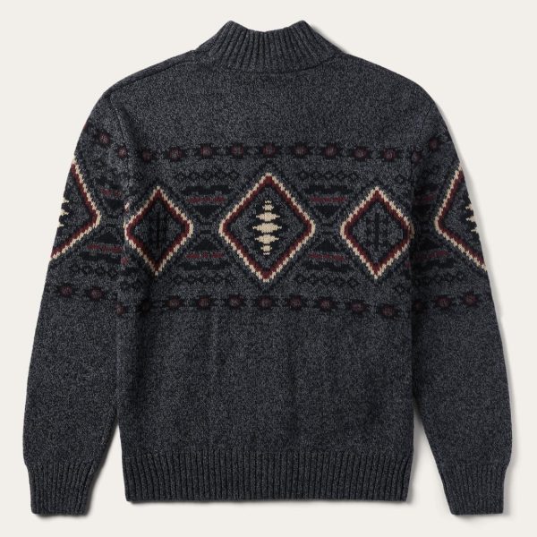 This charcoal gray zip-front cardigan features an exclusive horizontal Aztec-inspired design on its front, back and sleeves. It has two side pockets and a self-knitted collar, cuffs and waistband. Made from a wool blend, it provides warmth, comfort, and a dose of rugged style.