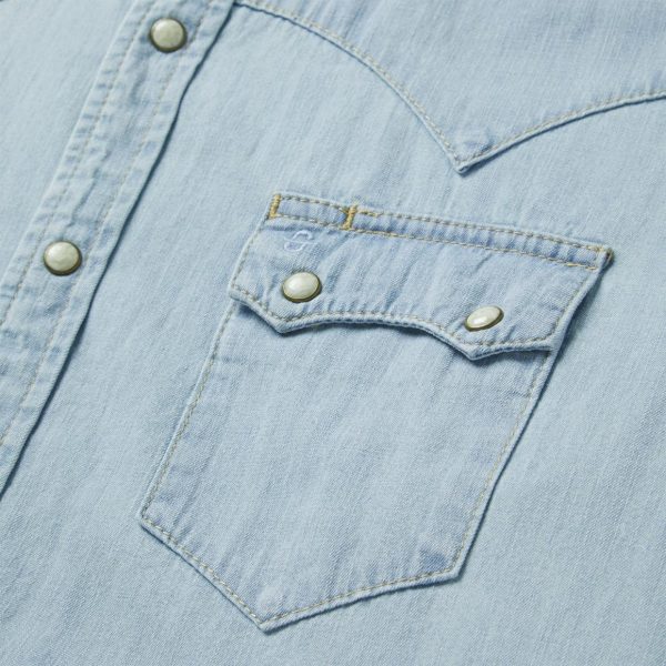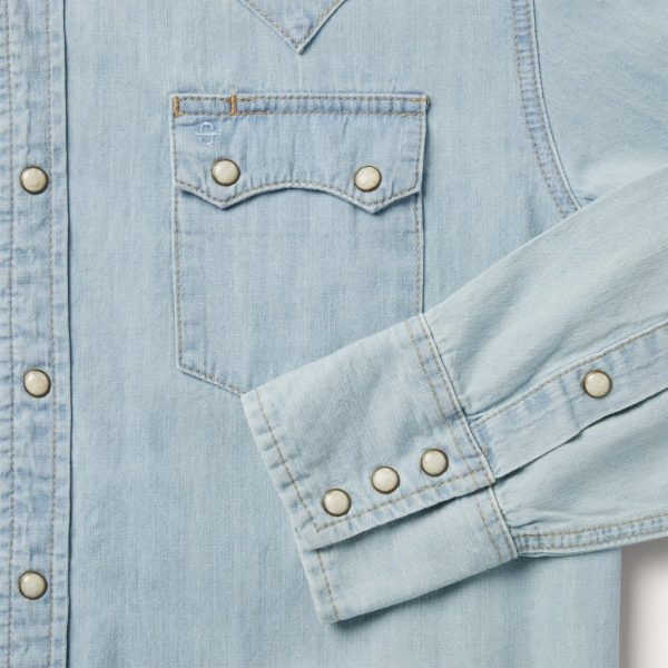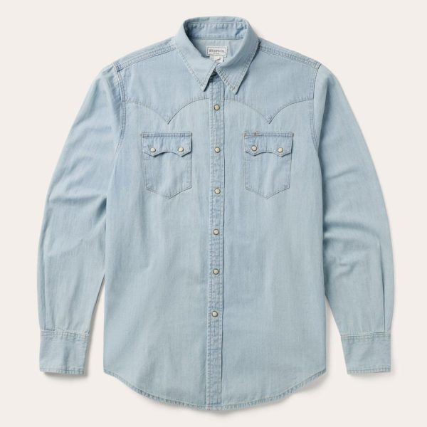 This light blue Western-style shirt is crafted from 100% cotton denim that has been sandblasted for a lived-in look. It has a two point curved back yoke and two point curved pocket flaps with a Stetson “S” embossed on the front left pocket, and “STETSON” embossed on the right sleeve placket. The classic snap front features logo snaps, while the three snap cuff offers a secure fit. Cut with a trim, modern fit for the perfect blend of comfort and style.