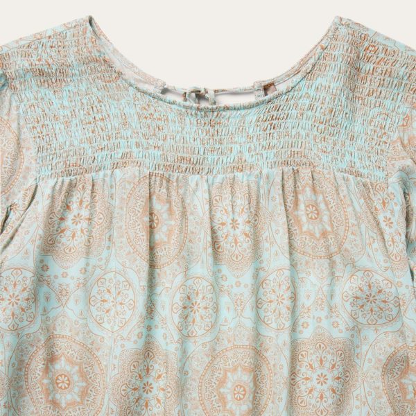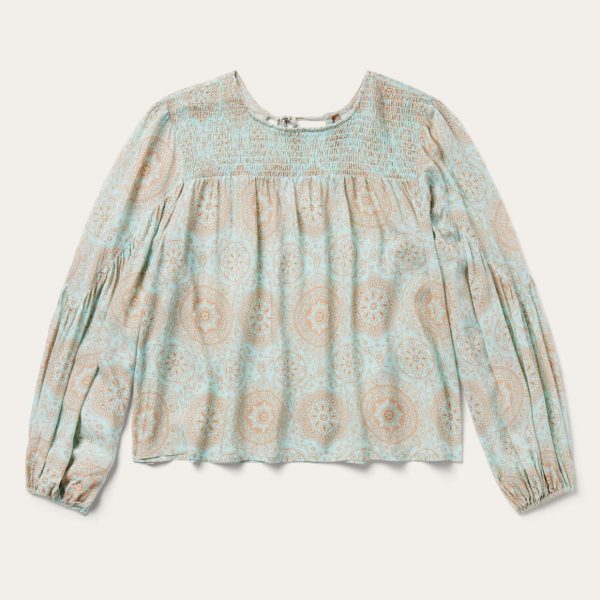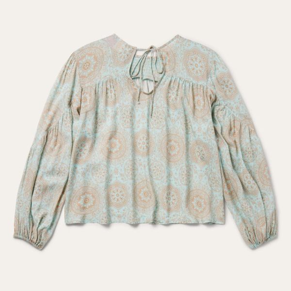 This long sleeve pullover peasant blouse features an exclusive aqua colored Mandala print and is crafted from soft 100% rayon. It has an elastic shirred center front yoke and is gathered below the front and back yokes. Its long sleeves include triangle sleeve yokes, along with elastic cuffs. Cut with an easy, flattering drape, the blouse allows for all-day comfort and freedom of movement.