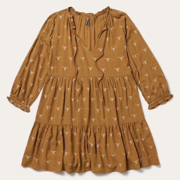 Fit for any cowgirl, this dress wears its Western influence proudly with an exclusive all-over Mojave steer head print. Crafted of high-quality 100% flat rayon, it has a light, airy texture and a flattering fit that allows for freedom of movement. It features 3/4 sleeves with elastic and ruffle cuffs, a ruffle stand collar with self tie closure keyhole neckline and is gathered at the neckline and both skirt tiers.