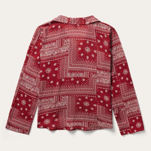 This pullover blouse is crafted from soft, smooth 100% rayon and features a Western-inspired allover Red Bandana Patchwork print. It has a flattering open notch collar V-neck and long sleeves with a slight bell. The large pleat at the center front creates a slimming effect, while the relaxed fit and lightweight fabric ensure all-day comfort and freedom of movement.