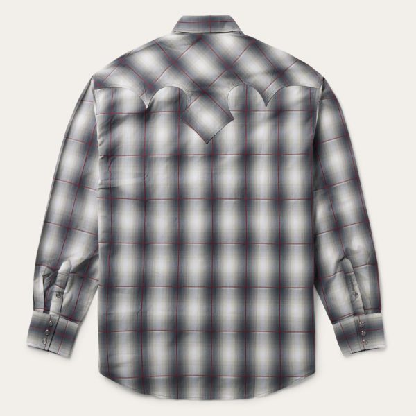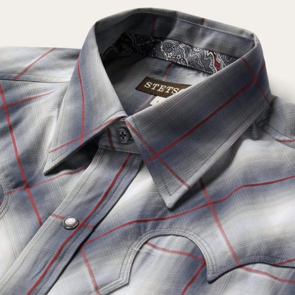 This Western shirt is crafted from a yarn dyed Smoke Ombre plaid with satin stripe. It features fancy front and back yokes with triple needle stitching, a Stetson “S” logo embossed on the front left pocket, and “STETSON” embossed on the right sleeve placket. It has a contrast inside trim, 3 snap cuff, and classic snap front featuring logo pearl snaps. Made from 100% cotton for quality and breathability, it has a feel that will only get better with age.