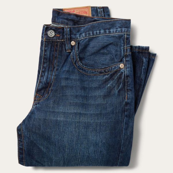 Crafted from 100% cotton denim, these 1520 Standard Fit Jeans have a a mid rise, straight leg, relaxed thigh and bootcut leg opening. The classic 5-pocket style features V-shape heavy contrast deco stitching on the back pockets for a touch of Western-inspired style, along with Stetson branded buttons, rivets, and zipper. Light hand sanding and whisker details complete the jeans for a lived-in look.